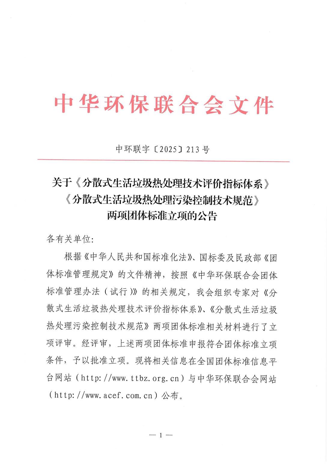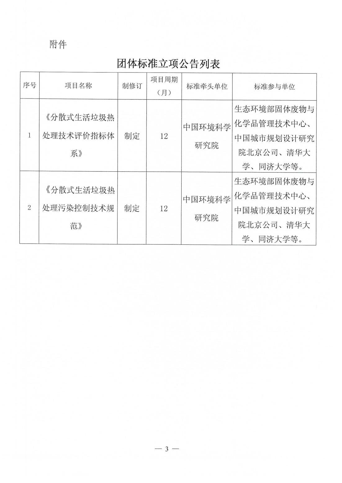 关于《分散式生活垃圾热处理技术评价指标体系》《分散式生活垃圾热处理污染控制技术规范》两项团体标准立项的公告
