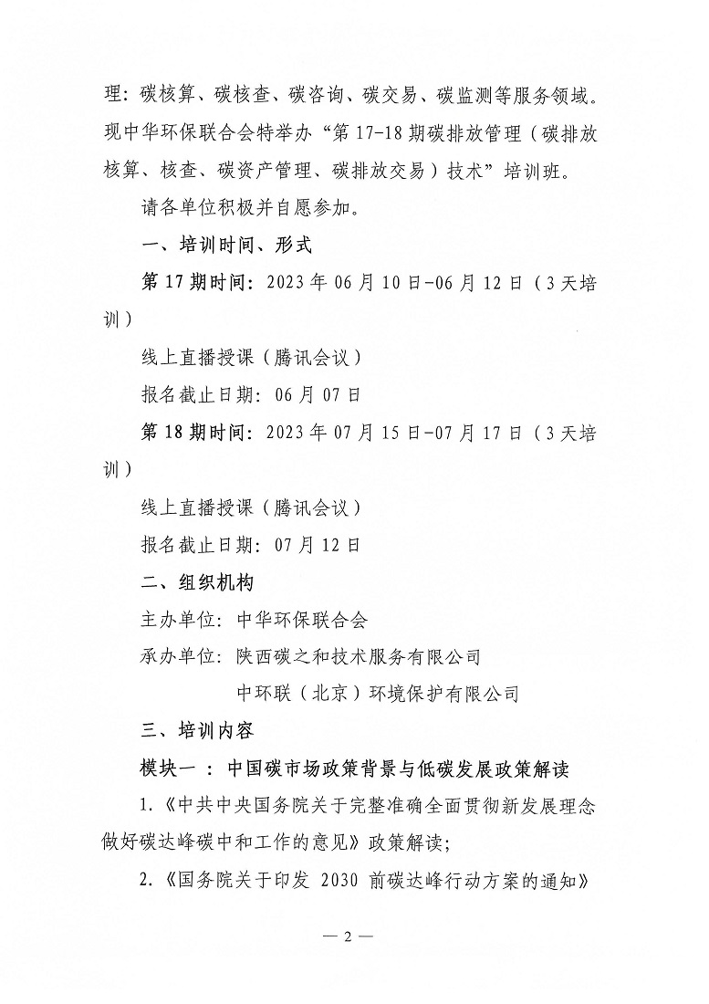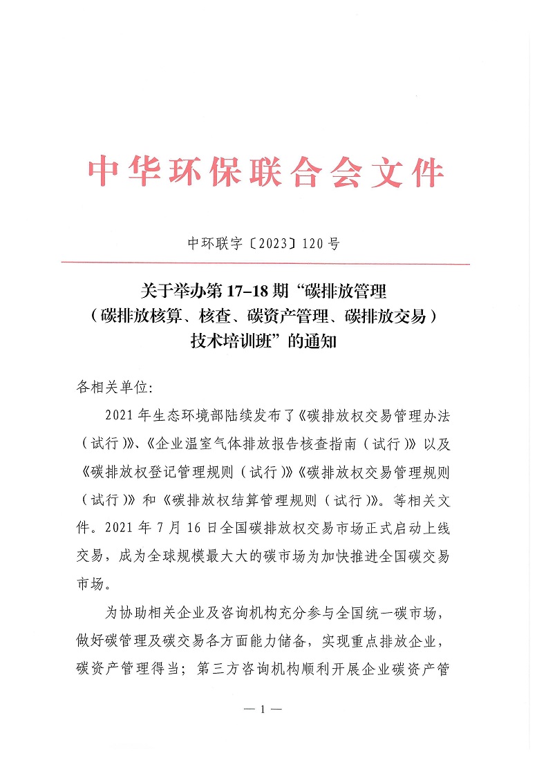 关于举办第17-18期“碳排放管理(碳排放核算、核查、碳资产管理、碳排放交易)技术培训班”的通知