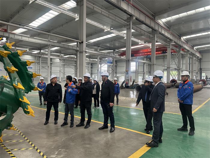 在石祥秘书长以及王朋董事长等人的陪同下,亚历山大·提阿博部长,基里巴斯驻华大使戴维·提阿博阁下一行参观了巨龙公司的生产车间、技术展示中心与装备调试基地。代表团详细了解了环保疏浚装备的制造工艺、技术参数与作业性能,并现场观摩了智能挖泥船、两栖疏浚设备等产品的试运行。