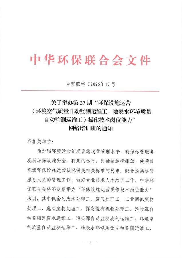 关于举办第27期“18luck新利苹果(环境空气质量自动监测运维工、地表水环境质量自动监测运维工)操作技术岗位能力”网络培训班的通知