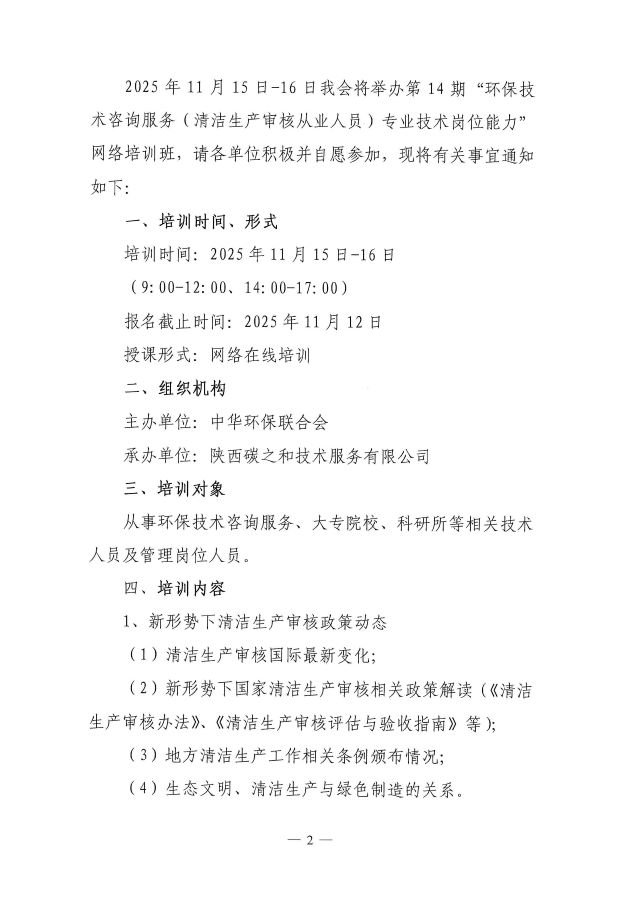 关于举办第14期“环保技术咨询服务(清洁生产审核从业人员)专业技术岗位能力”网络培训班的通知