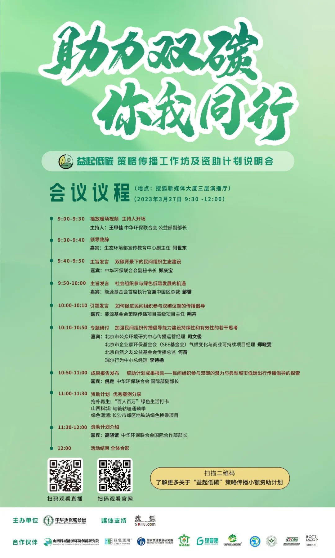 为促进民间组织以多元视角和创新策略参与双碳议题,分享本土机构在推动公众低碳生活方式转变上的思考,“益起低碳”策略传播工作坊及资助计划说明会将于2023年3月27日于北京举行。本次会议将围绕民间组织如何更好的参与双碳议题传播倡导开展研讨,分享资助计划一期、二期优秀案例和相关经验,并介绍资助计划下一步的聚焦议题和相关要求。
